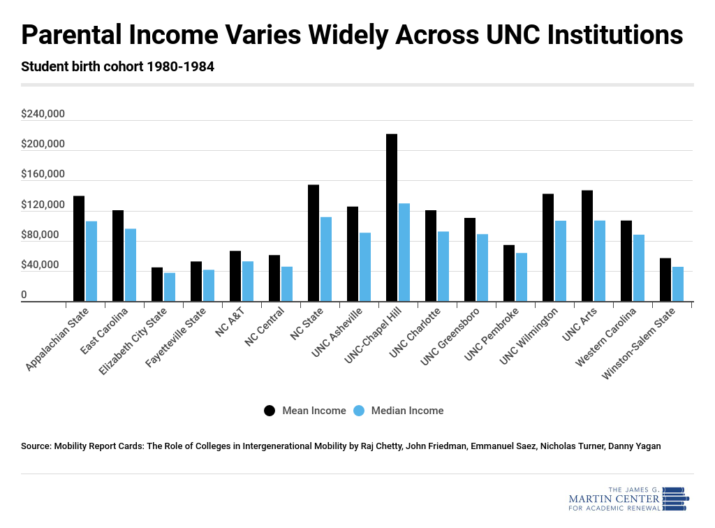 The University of North Carolina system boasts a diverse set of institutions. There are many ways in which the 16 schools differ: size, geography, research intensity, curriculum, and student characteristics. They also differ in terms of students’ family income.