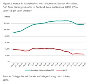 Rather than lowering tuition or cutting costs, many public institutions have opted to raise sticker prices and selectively discount them (see figure below). That strategy may help stabilize enrollment in the short term, but it shifts risk onto students and families and obscures how much college actually costs. It also mirrors the private-college pricing model that public universities once avoided.
