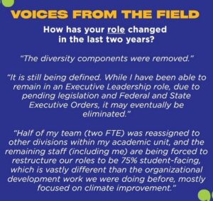 For example, due to the formatting of the report, it appears that NADOHE wants readers to focus on comments in a highly visible purple square implying that many DEI offices have been shut down, altered, or eliminated. In reality, however, the survey found that only eight percent of those who indicated a change to their role noted that it had been discontinued outright or that their responsibilities had been discontinued. In other words, only 12 of the 394 participants indicated having lost their DEI role in the past two years, despite the Trump administration’s attempts to cull DEI in higher ed.