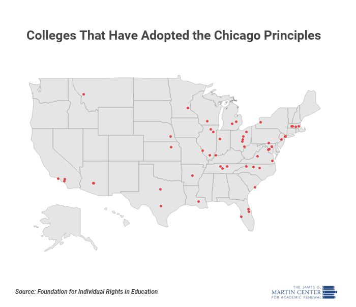 The Foundation for Individual Rights in Education (FIRE) endorsed the statement, which has been adopted by more than 50 colleges and universities. The map above shows their locations.