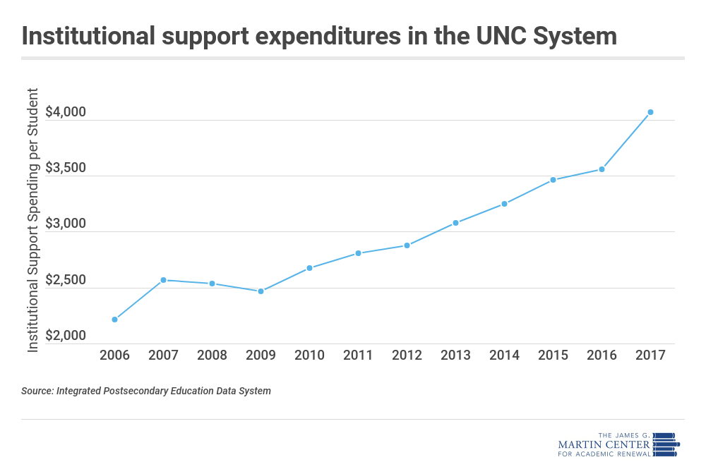 Expenditures for institutional support in the UNC system have increased significantly: from $2,217 per student in 2006 to $4,069 per student in 2017. Adjusted for inflation, that’s nearly 50 percent growth in just 11 years.