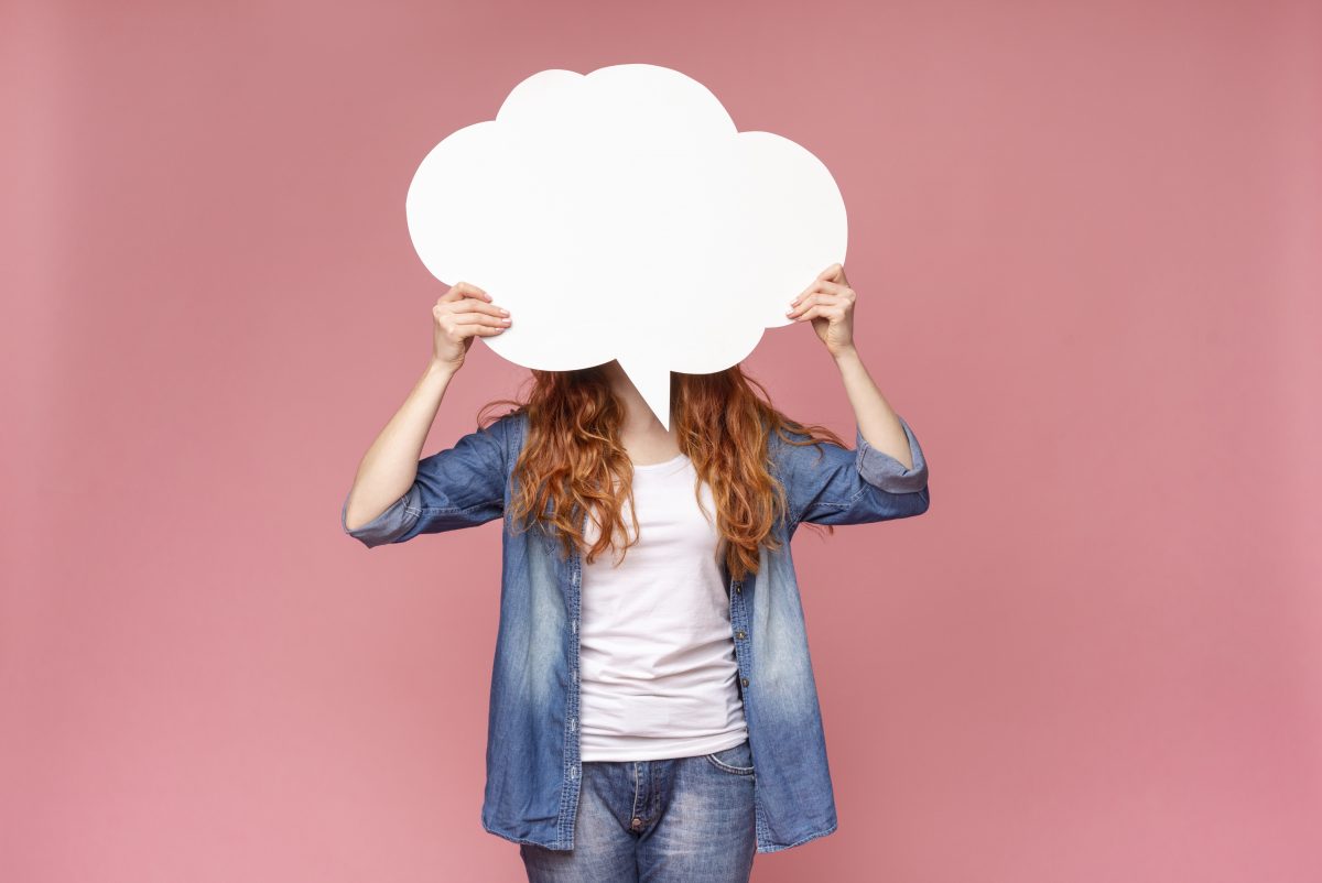 Redhead female hiding her face behind blank white speech bubble, pink studio background Editor’s Note: This is an excerpt from The Not-So-Great Society, published by the Heritage Foundation.
