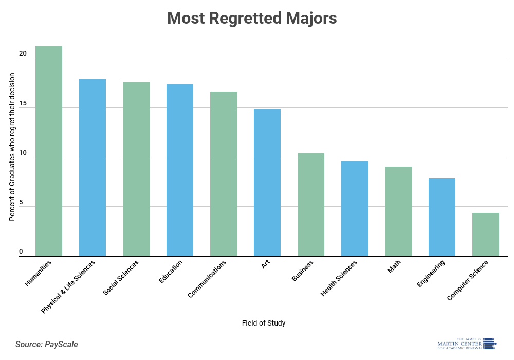 The regret comes from economic struggles. Unsurprisingly, students most regretted studying the humanities, followed by physical and life science, social sciences, and education and communications.