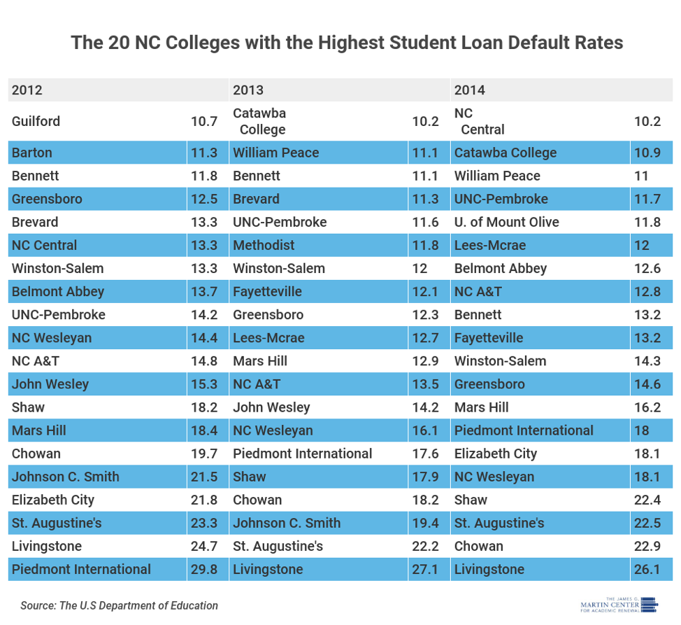 Not all colleges, unfortunately, improved their default rates. Livingstone College in Salisbury and St. Augustine’s College in Raleigh maintained some of the highest federal loan default rates in the state at 26.1 percent and 22.5 percent, respectively. Fellow HBCUs Elizabeth City State University and Johnson C. Smith University had dramatic changes in their default rates—ECSU went from 7.1 percent in 2013 to 18 percent in 2014, and Johnson C. Smith went from about 20 percent in 2013 to 2.1 percent in 2014.
