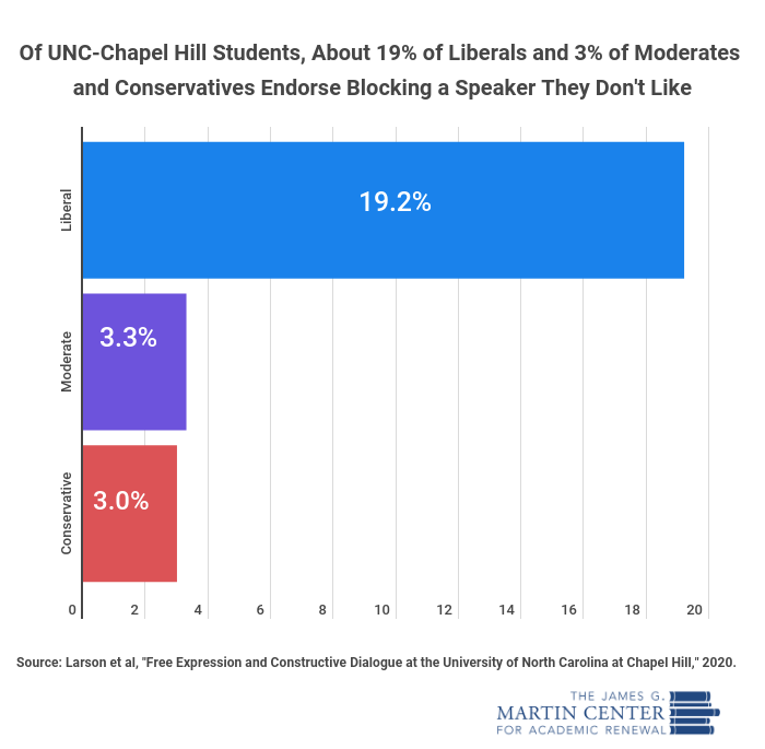 From the data, professors Jennifer Larson, Mark McNeilly, and Timothy J. Ryan presented 12 principal findings, one of which was the fact that 19.2% of self-identified Liberals, 3.3% of self-identified Moderates, and 3.0% of self-identified Conservatives endorse blocking a speaker with whom they do not agree.