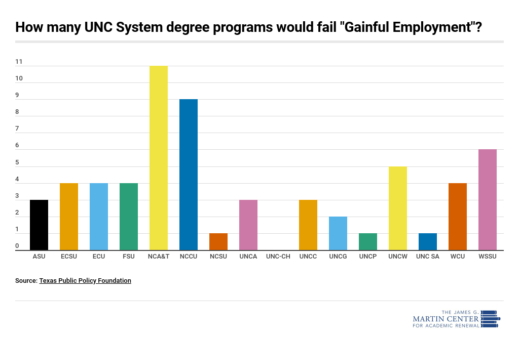 According to TPPF’s new tool, earnings and debt data were available for 28,812 UNC system students who graduated between 2014 and 2016. Of those, 57 percent graduated from programs that would pass TPPF’s “Gainful Employment Equivalent.” About 33 percent graduated from programs that would be on probation (Zone), and 2,891 (10 percent) graduated from programs that would fail. Earnings or debt data were unavailable for 459 UNC system programs.