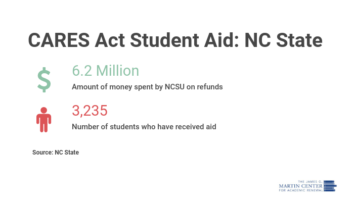 NC State estimates, however, that 20,651 of its students are eligible for funds. If all students received a check, they would get $433. The university doesn’t appear to expect all qualified students to request aid. For the students who do receive CARES Act aid, they have a de facto tuition discount. That aid, however, doesn’t come close to how much all students could receive if colleges lose the class-action suits and must give refunds.