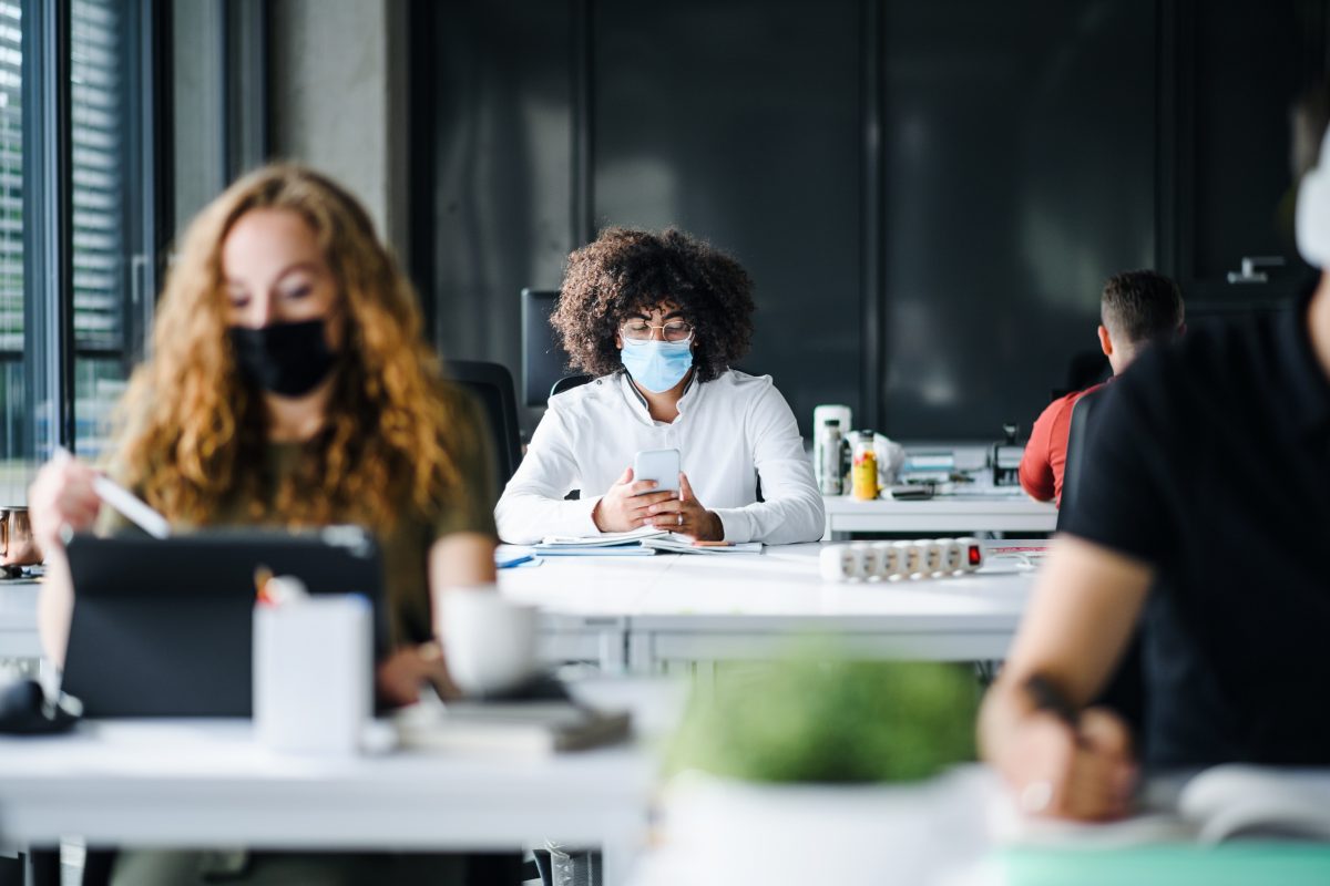 Young people with face masks back at work in office after coronavirus quarantine and lockdown.