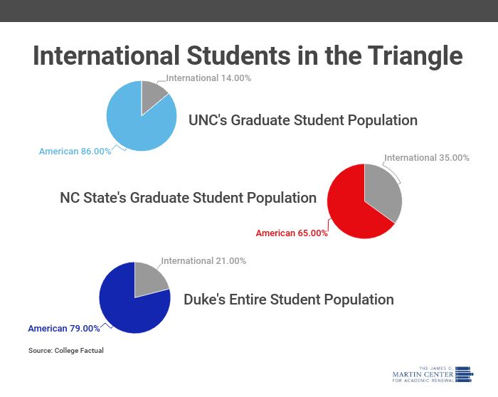 NC State, for example, cited data that North Carolina’s “21,092 students contributed $670.6 million and supported more than 8,600 jobs” in the North Carolina economy. North Carolina’s top schools have large international populations. At UNC, foreign students make up 14 percent of the graduate student population and total 1,627 international students overall. Duke and NC State both have large international student populations with 3,369 students and 4,328 international students, respectively.
