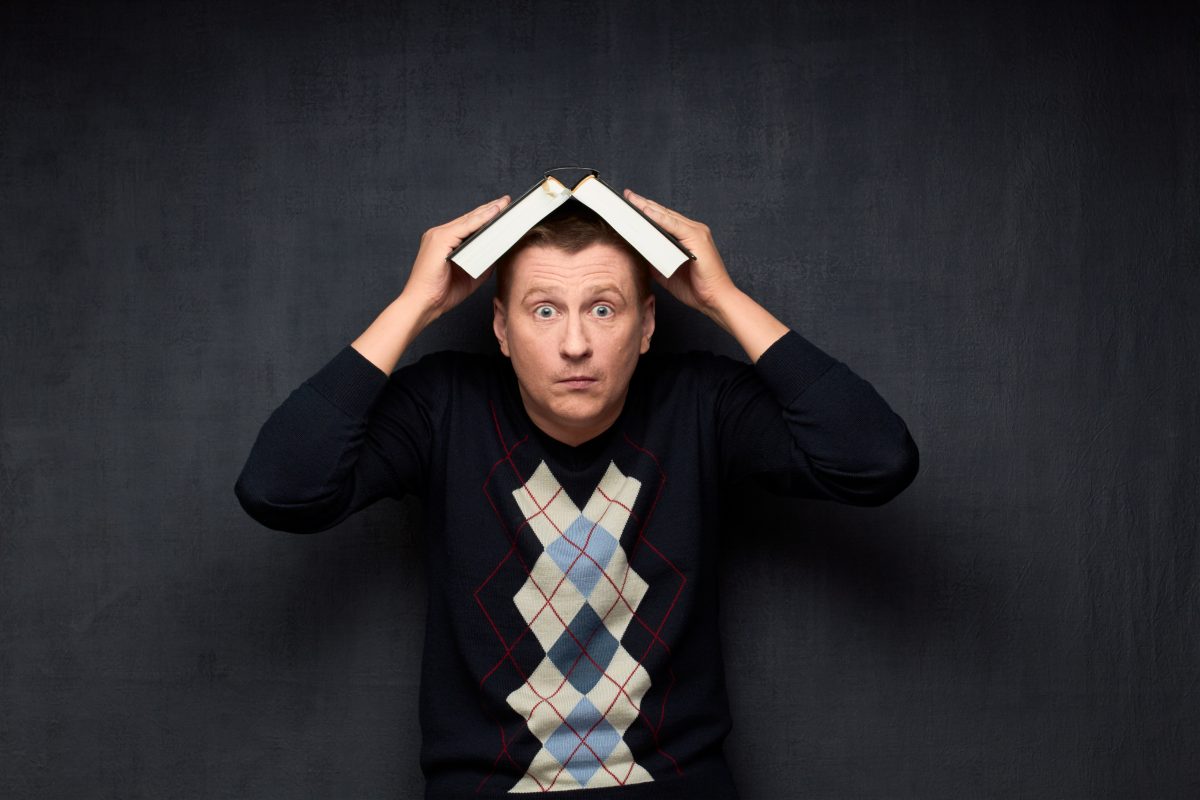 Studio half-length portrait of puzzled caucasian fair-haired man wearing sweater, holding big opened book on his head, looking with surprise and bewilderment at camera, against gray background Law schools in the U.S. used to be run by no-nonsense individuals who, whatever their personal politics, thought that their institutions existed to teach students about the law, not to engage in advocacy or speculation.
