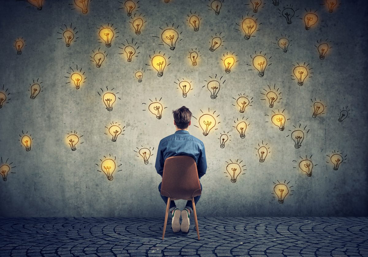 Man sitting on a chair has many bright ideas looking at wall making decisions How do we teach students how to think rather than what to think?