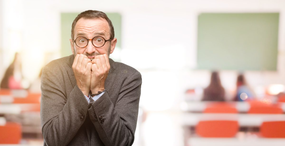 Teacher man using glasses terrified and nervous expressing anxiety and panic gesture, overwhelmed at classroom One of the stories in my new book, The Dumbest Generation Grows Up: From Stupefied Youth to Dangerous Adults is that of the changed status of undergraduates and professors. They don’t relate to one another the way they used to. If you wandered the hallways at State U in 1980, you’d sense an ordinary relationship of students and teachers, one side in charge, the other obedient (whether because of fear, custom, or sincere respect—it would vary). Do it today, and you get a whole other feel. Let me explain.
