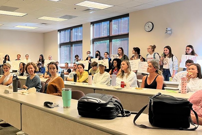 The event began as scheduled. However, protestors, many of them from the LGBT student group Carolina Outlaw, attempted to disrupt and possibly shut down the event with repeated chants of “the Founders were enslavers.” At times, the speaker could not be heard. At the direction of a Law School dean, UNC security personnel did not enter the room. Instead, they stood in the hallway and allowed disruptions to continue. All protesters were allowed to stay, despite their repeated interruptions of the event.