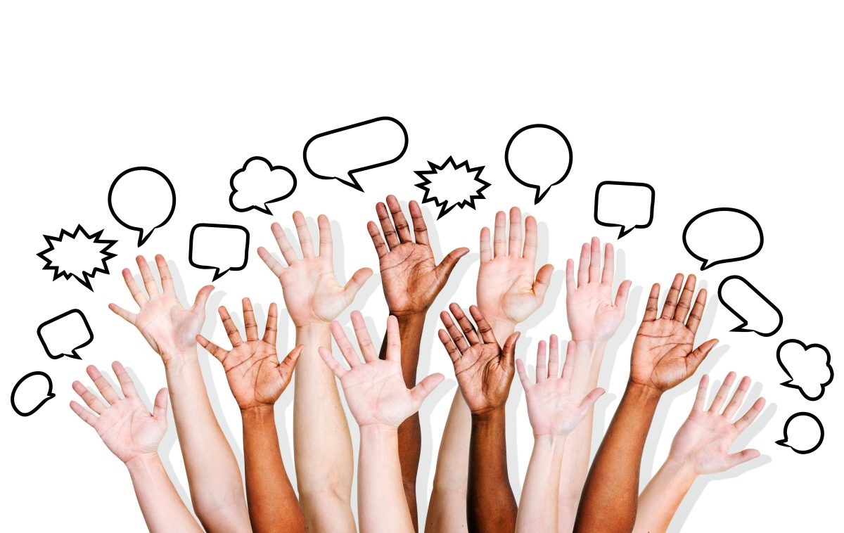 Multi ethnic people's hands raised with speech bubble. I don’t sleep much after chairing a Braver Angels college debate. There’s a surge of excitement that reverberates for hours after I guide the collision of highly charged, diverse viewpoints that students carry into the classroom or auditorium. It defies gravity and buoys me up—which explains why I began writing this essay late at night in my hotel room after leading a debate on the campus of UNC Greensboro this past semester.